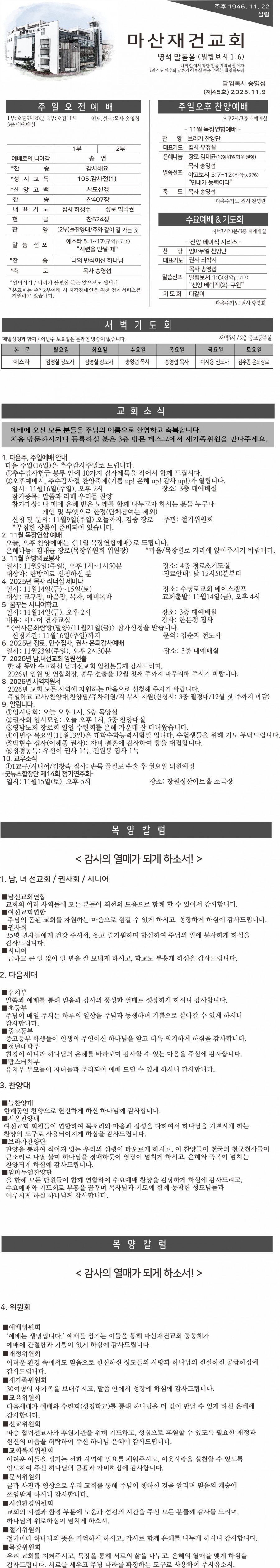 2025년11월9일 교회주보 페이지 정보 작성자 마산재건교회 댓글 0건 조회 127회 작성일 25-11-08 18:18 본문 . 목록 다음글2025년11월2일 교회주보 25.11.01 댓글목록 댓글목록 등록된 댓글이 없습니다.
