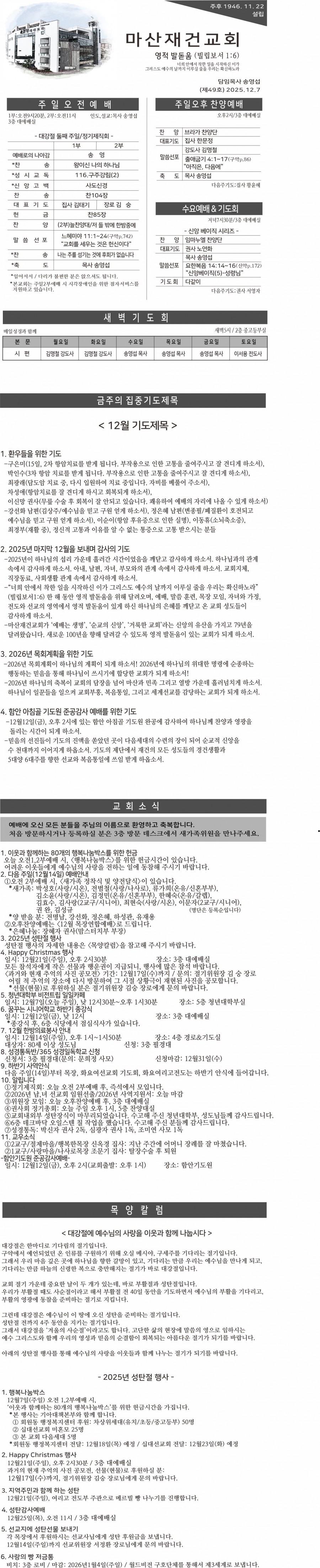 2025년12월7일 교회주보 페이지 정보 작성자 마산재건교회 댓글 0건 조회 135회 작성일 25-12-06 18:12 본문 . 목록 다음글2025년11월30일 교회주보 25.11.29 댓글목록 댓글목록 등록된 댓글이 없습니다.