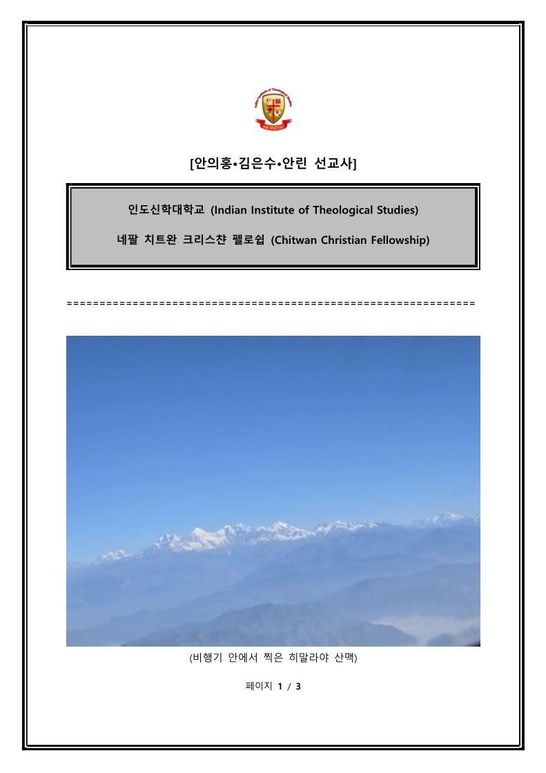 안의홍 선교사(네팔, 후원: 3교구/충성마을/안드레목장) 페이지 정보 작성자 마산재건교회 댓글 0건 조회 36회 작성일 26-01-17 14:51 본문 . 목록 이전글양용태 선교사(그리스, 후원: 1교구/희락마을/베드로 목장) 26.01.24 다음글GMTC(선교훈련원) 12월 감사편지 26.01.17 댓글목록 댓글목록 등록된 댓글이 없습니다.