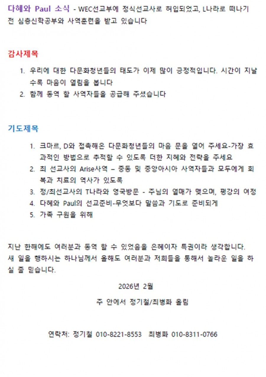 정기철 선교사(영국, 후원:2교구/사랑마을/기드온목장) 페이지 정보 작성자 마산재건교회 댓글 0건 조회 22회 작성일 26-03-14 12:30 본문 . 목록 이전글안의홍 선교사(네팔, 후원: 3교구/충성마을/안드레목장) 26.03.14 다음글GMTC(선교훈련원) 1월 감사편지 26.02.12 댓글목록 댓글목록 등록된 댓글이 없습니다.