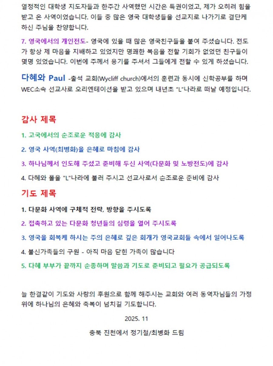 정기철 선교사(영국, 후원:1교구/사랑마을/기드온목장) 페이지 정보 작성자 마산재건교회 댓글 0건 조회 5회 작성일 25-11-06 17:57 본문 . 목록 이전글안의홍 선교사(네팔, 후원: 3교구/충성마을/안드레목장) 25.11.06 다음글박희경 선교사(필리핀,후원: 1교구/사랑마을/나사로목장) 25.10.24 댓글목록 댓글목록 등록된 댓글이 없습니다.
