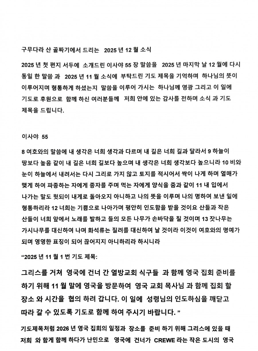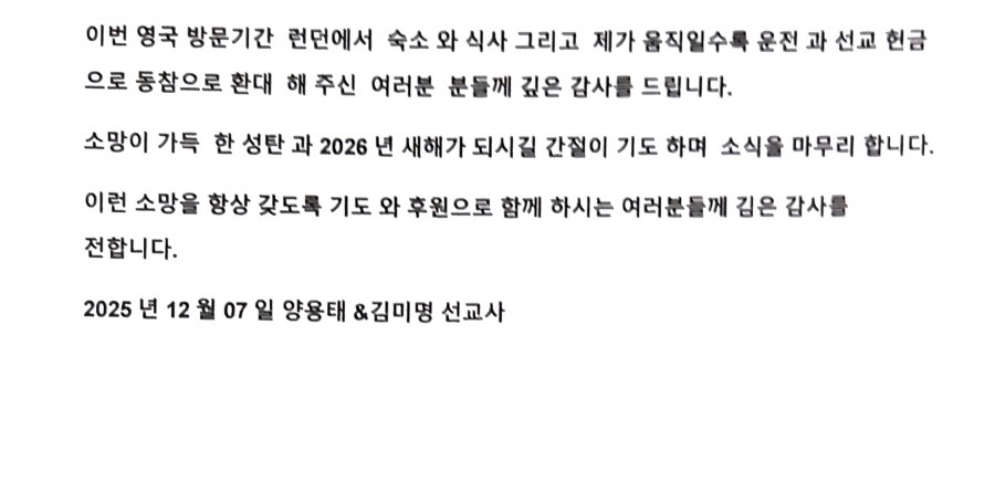 양용태 선교사(그리스, 후원: 1교구/희락마을/베드로 목장) 페이지 정보 작성자 마산재건교회 댓글 0건 조회 41회 작성일 25-12-09 15:30 본문 . 목록 이전글GMTC(선교훈련원) 11월 감사편지 25.12.10 다음글새생명가정연구원 기독상담센터 25.12.09 댓글목록 댓글목록 등록된 댓글이 없습니다.