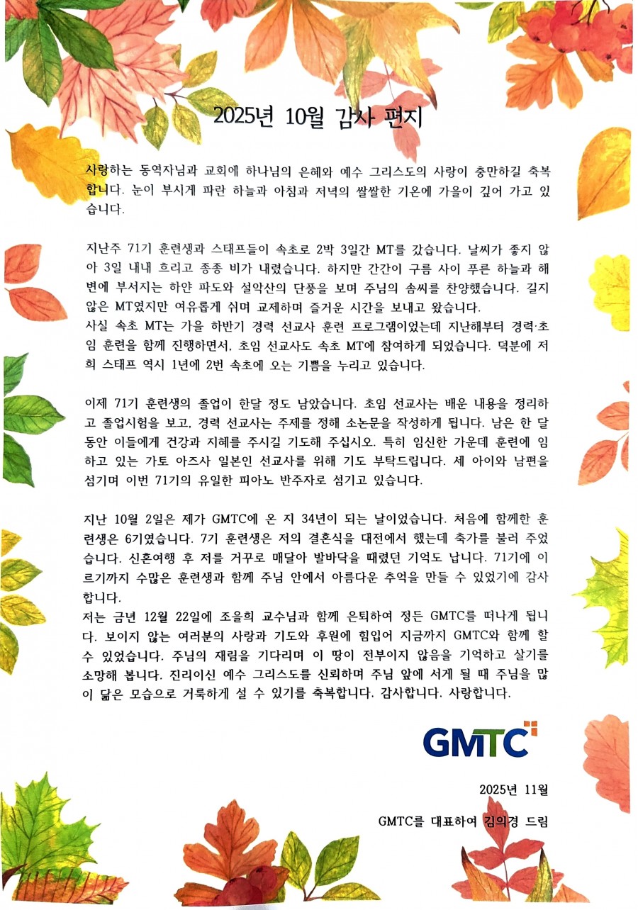 GMTC(선교훈련원) 10월 감사편지 페이지 정보 작성자 마산재건교회 댓글 0건 조회 4회 작성일 25-11-12 16:19 본문 . 목록 이전글강호춘 선교사(독일, 후원: 1교구/사랑마을/빌레몬목장) 25.11.12 다음글안의홍 선교사(네팔, 후원: 3교구/충성마을/안드레목장) 25.11.06 댓글목록 댓글목록 등록된 댓글이 없습니다.
