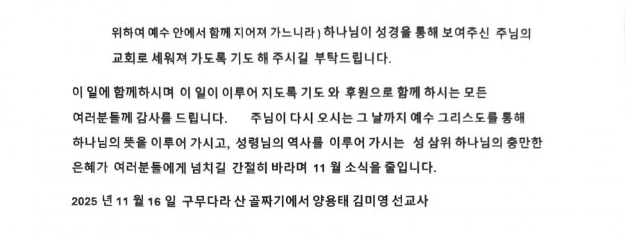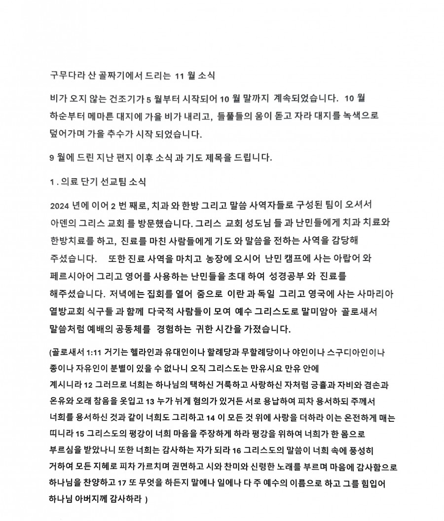 양용태 선교사(그리스, 후원: 1교구/희락마을/베드로 목장) 페이지 정보 작성자 마산재건교회 댓글 0건 조회 18회 작성일 25-11-26 16:49 본문 . 목록 이전글라브리선교회(후원: 1교구/사랑마을/시온목장) 25.11.26 다음글강호춘 선교사(독일, 후원: 1교구/사랑마을/빌레몬목장) 25.11.12 댓글목록 댓글목록 등록된 댓글이 없습니다.